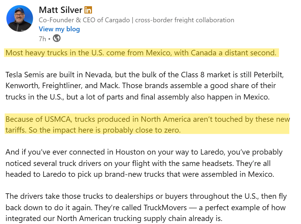 Matt Silver, Co-Founder and CEO of Cargado, argues the impact could be "close to zero" if USMCA protections hold.