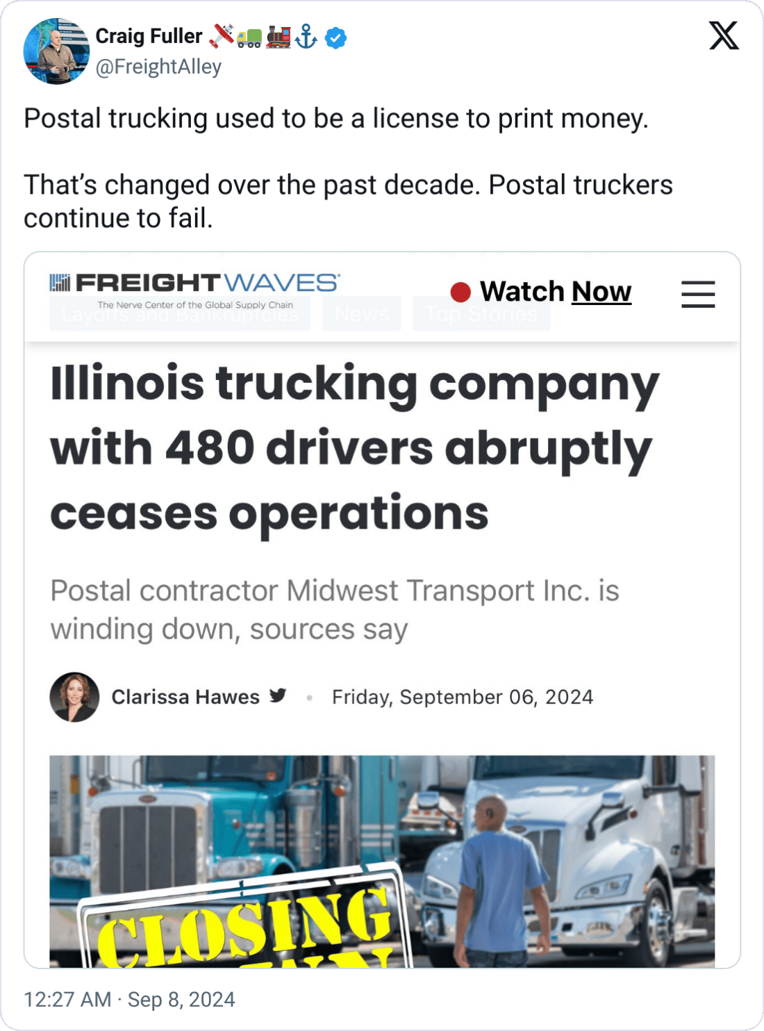 "Postal trucking used to be a license to print money. That's changed over the past decade. Postal truckers continue to fail."