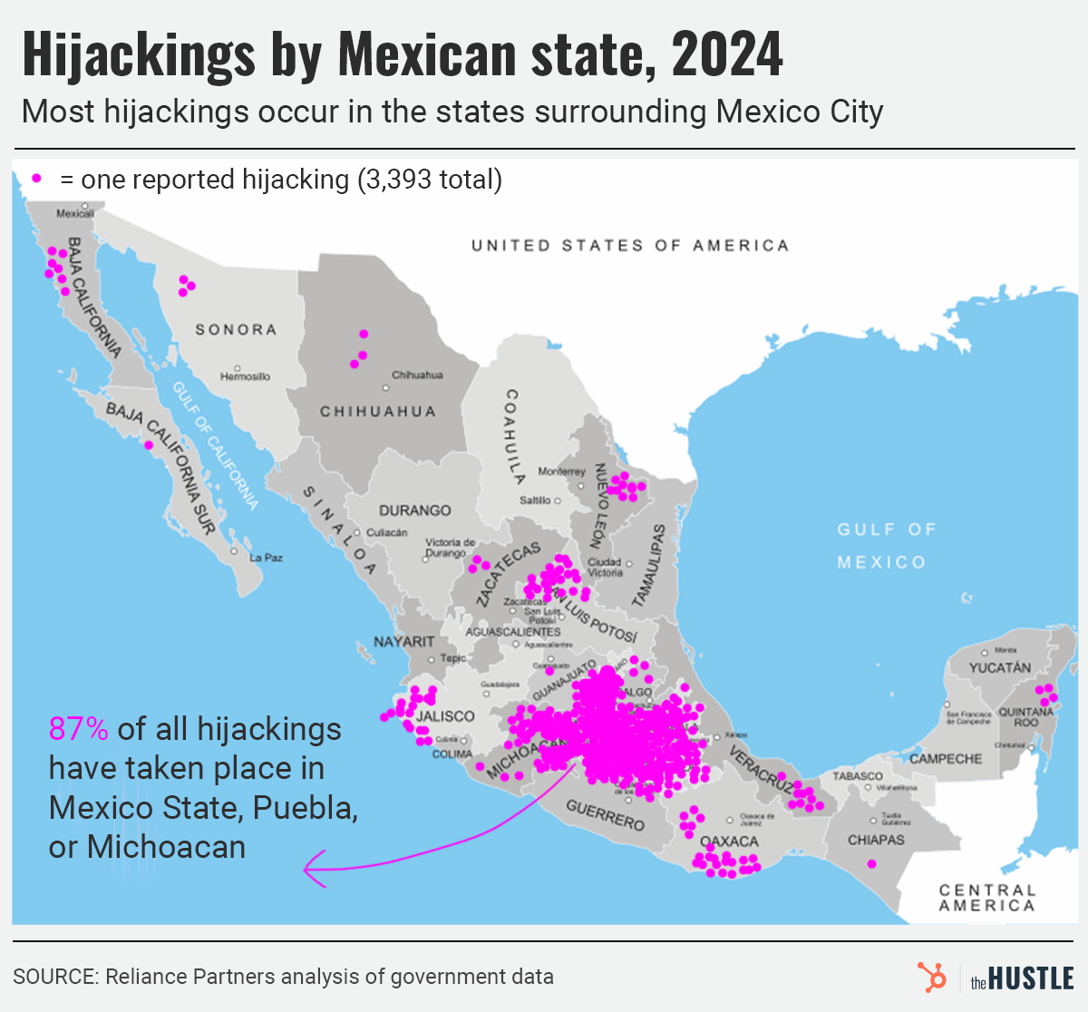 🚛 Mexico’s Booming Trade Facing Hijacking Crisis. Mexico's U.S. trade is thriving, surpassing China with $500B in imports in 2023. However, organized crime is exploiting the surge, making Mexico the top hotspot for cargo truck hijackings globally. The increase in truck crossings has attracted major companies like Walmart and Tesla, but rampant crime—averaging 50* truck hijackings per day and nearly 150 driver murders annually—poses a serious threat to the country’s growth. Southern Mexico suffers from weak law enforcement, deterring investments. While President-elect Sheinbaum promises reforms, businesses are rethinking logistics amid the increasing dangers.