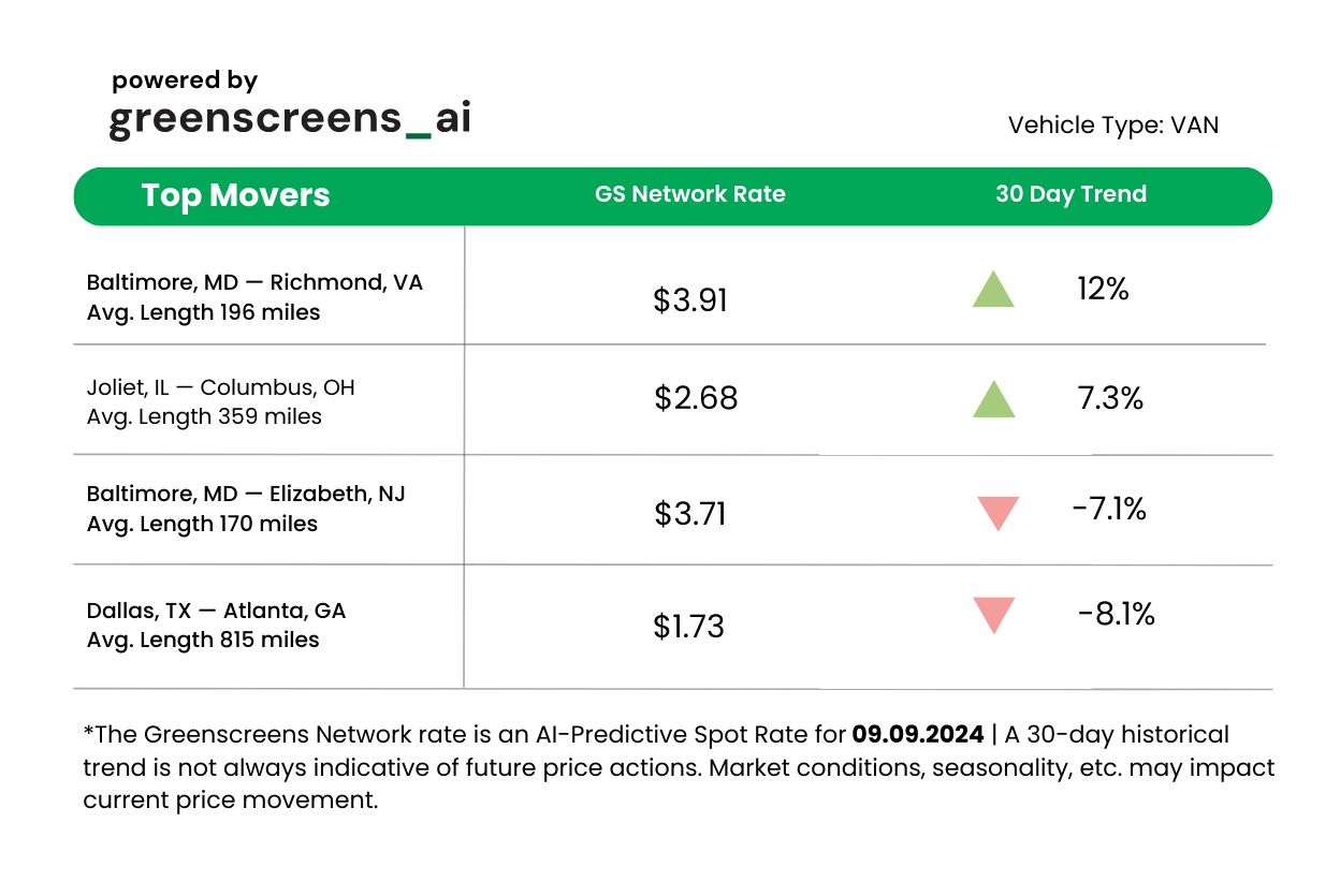 *Greenscreens.ai, forecasts real-time truckload buy prices that are suited to each freight brokerage's purchasing power using AI and machine learning. Its engine takes into account over 130 attributes and data points in each rate forecast.