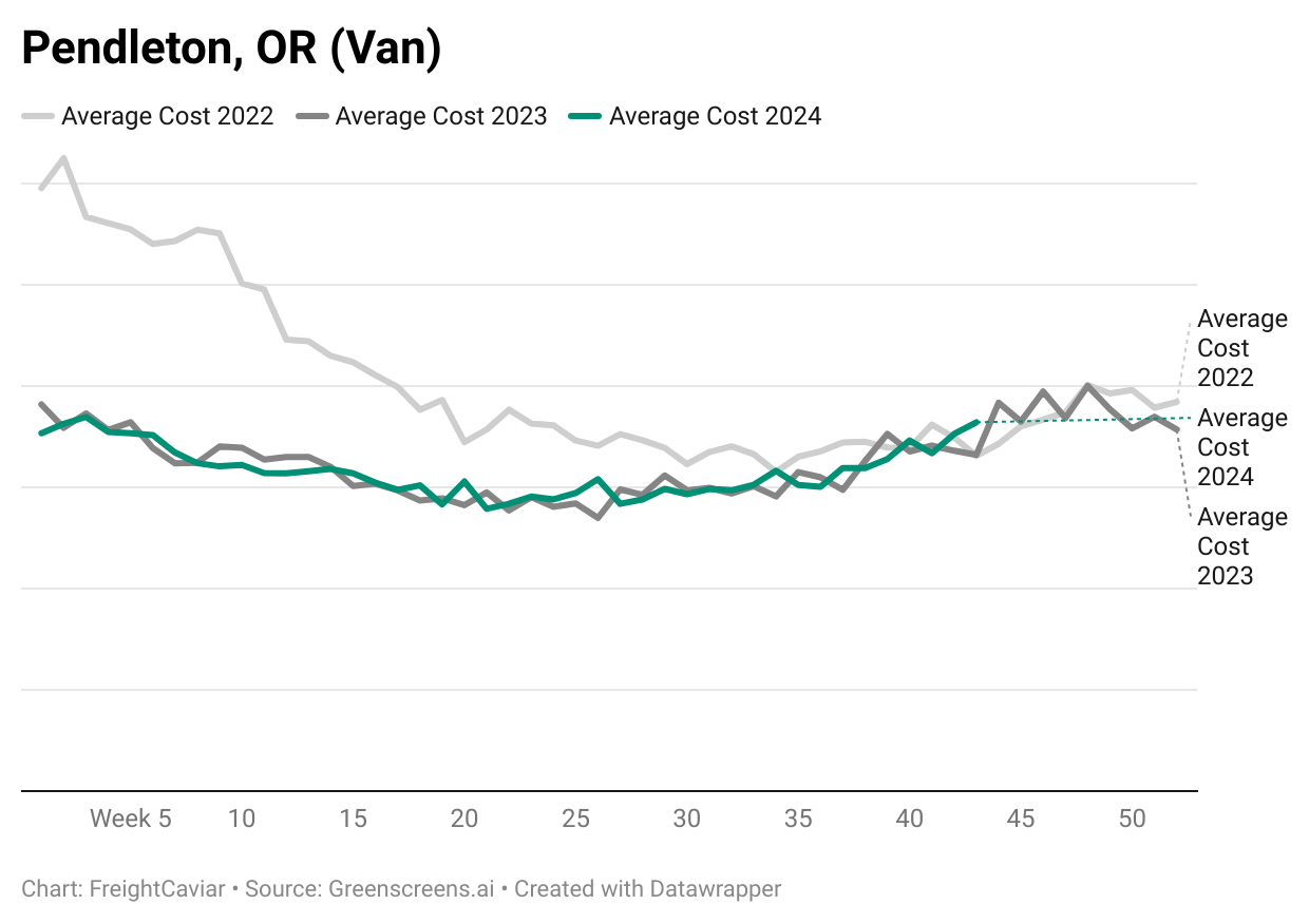 Pendleton, OR, is in a unique seasonal position, with demand cycles peaking from late summer stone fruits to Christmas tree shipments as we enter winter. Recently, rates for dry vans have started rising, signaling a stronger market that’s diverging from 2023’s lower costs.
