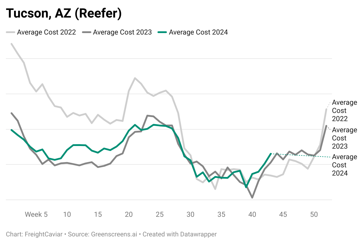 Bucking the Trend: Tucson’s reefer rates show a seasonal increase and are also higher than the previous two years, signaling strong demand and a break from typical seasonal declines.