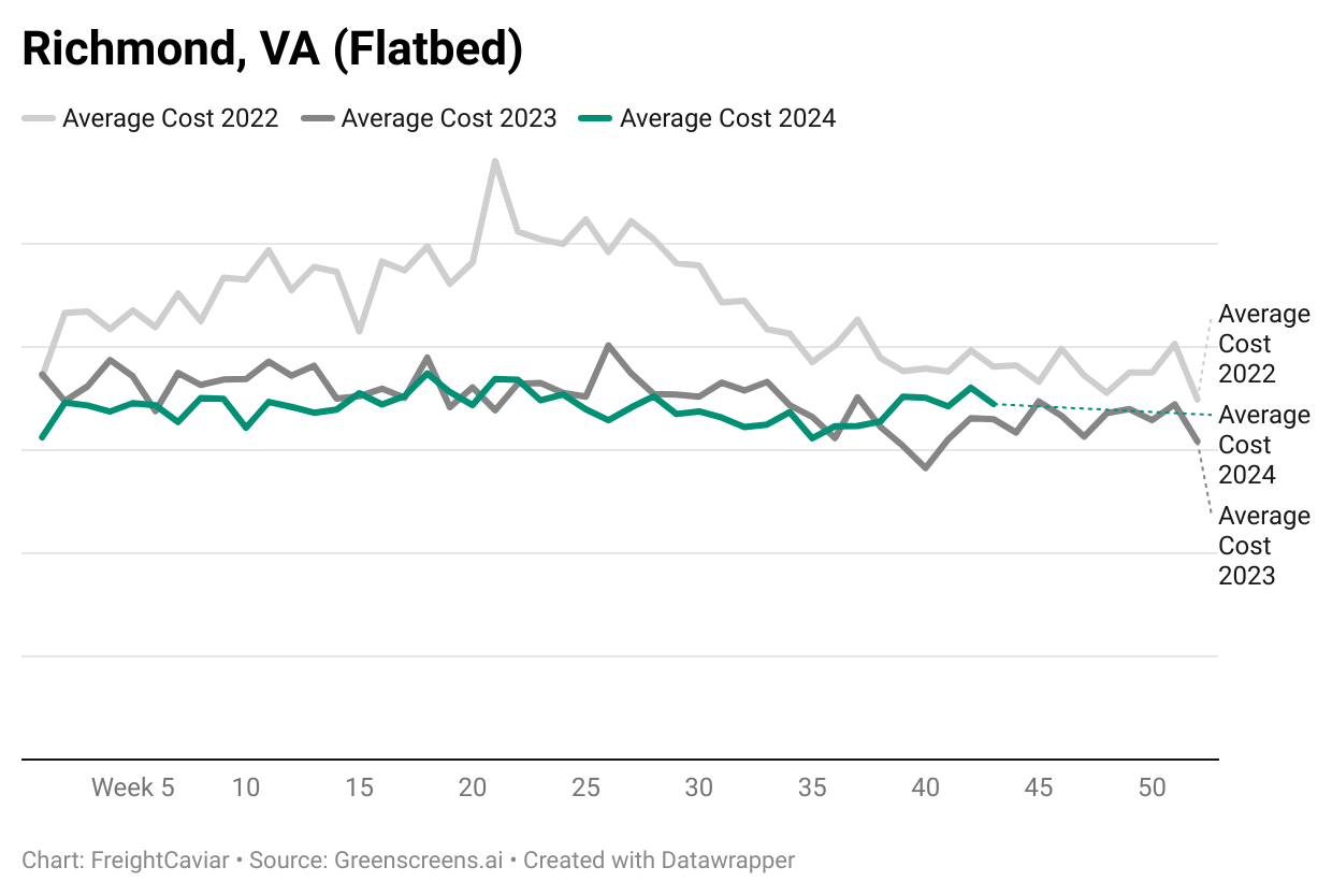 The Richmond, VA flatbed market has shown resilience in the Southeast, especially in the wake of hurricane season. While the rate increases are modest, the Richmond market is steadily maintaining prices above last year’s levels, even if the rise isn’t extreme.