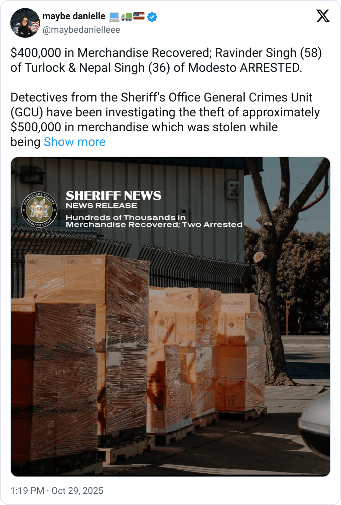 🔊 Electronic Cargo Heist. Thieves stole $500K in high-end home audio gear from a semi bound for a California Amazon warehouse. $400K in value was recovered. Two men were eventually arrested in Modesto and Turlock, CA.