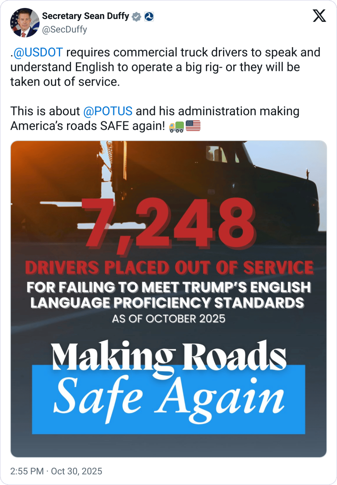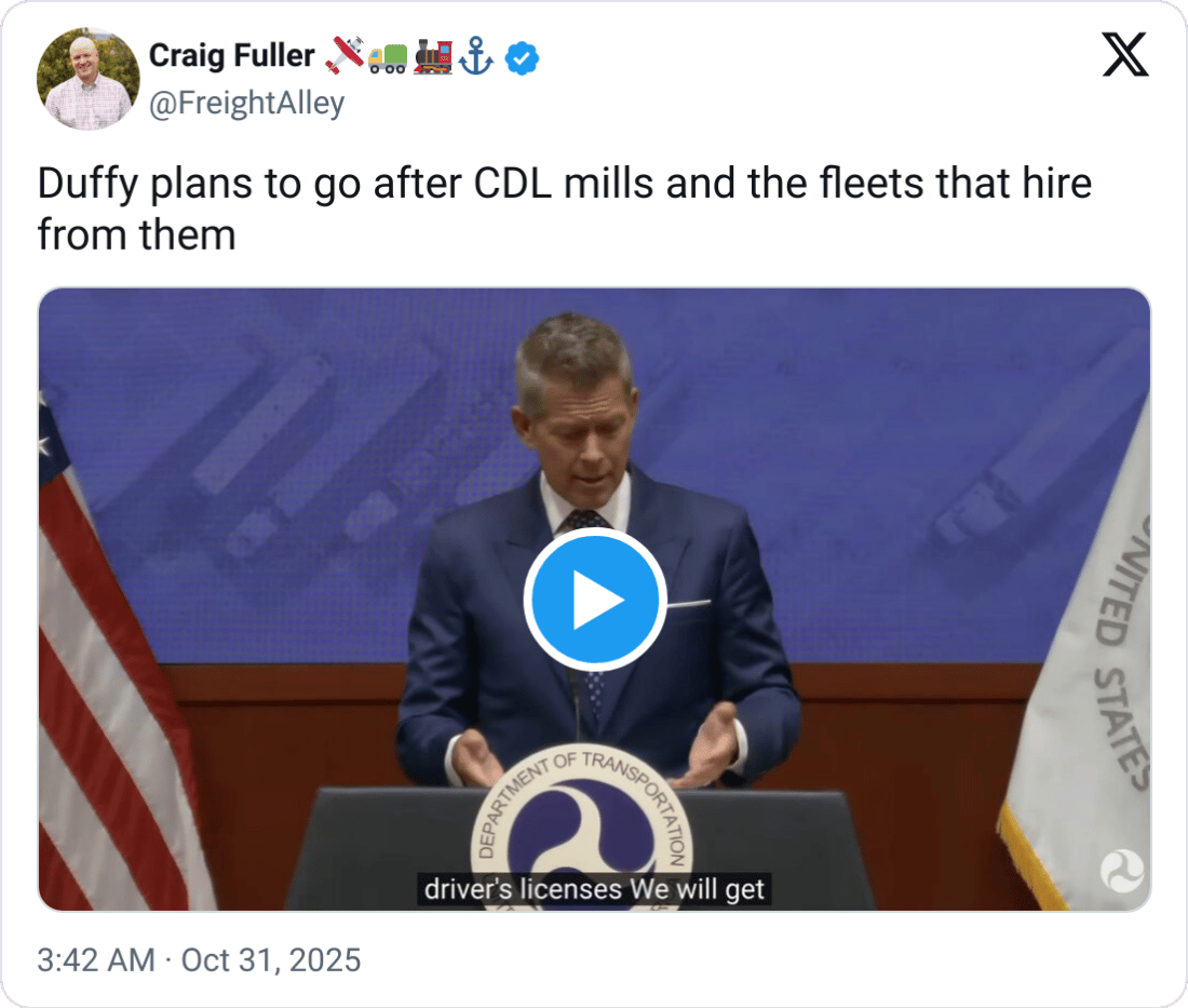 The federal crackdown isn’t limited to immigration. Duffy also confirmed 7,248 truck drivers have been placed out of service this year for violating English Language Proficiency (ELP) rules, reinstated under a June executive order.