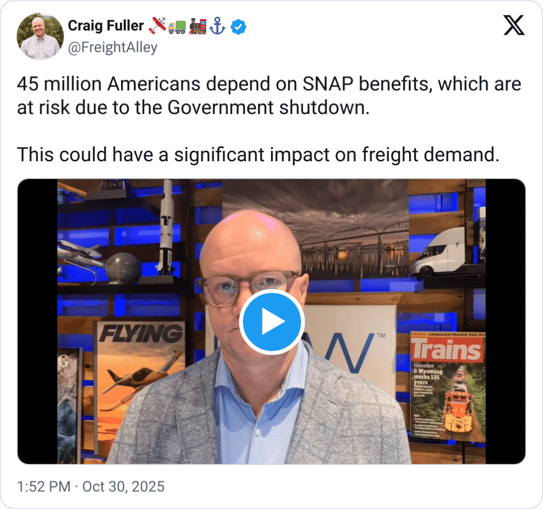 🥫 SNAP Cuts Threaten Freight Demand. More than 30 states warn food assistance could lapse next month amid the government shutdown, risking a consumer spending pullback just as holiday shipping begins. Inflation rose 3% in September, further squeezing households. Wells Fargo analysts say a SNAP pullback could drag down grocery and retail freight. Walmart, which captures over a quarter of SNAP grocery dollars, faces potential shipment declines alongside major suppliers. Jason Miller noted retail sales fell 3% and grocery trips 8.4% when expanded SNAP benefits ended in 2023, a pattern that could again pressure truckload volumes in Q4.