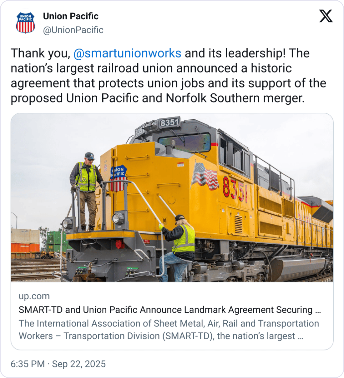 On September 22, Union Pacific and SMART-TD, the nation’s largest rail union, announced a landmark job protection agreement. The union, which once opposed the deal, flipped to endorse it after winning lifetime job guarantees.