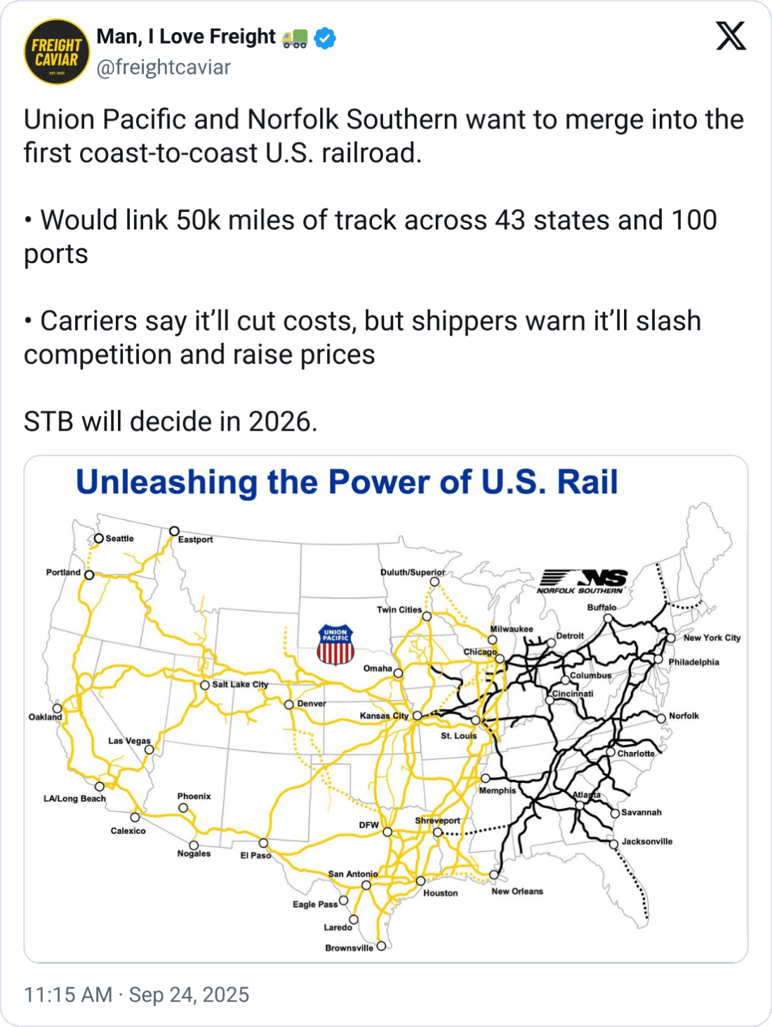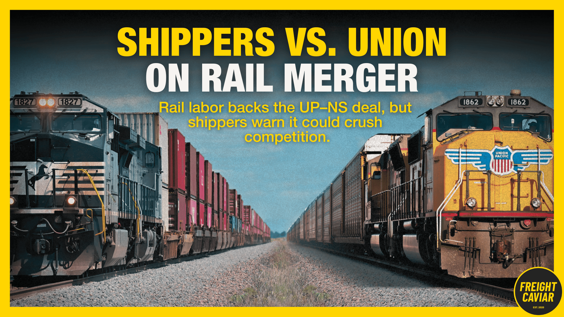 Good Wednesday morning. The $85B Union Pacific–Norfolk Southern merger just turned into a tug-of-war. Labor unions are celebrating lifetime job guarantees, while shippers warn of higher rates and fewer options. Details in today's feature.