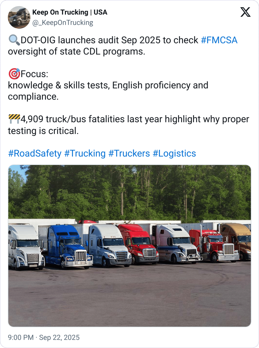 📝 USDOT to Audit FMCSA CDL Oversight. The U.S. DOT’s Inspector General has opened an audit into FMCSA’s oversight of state CDL testing programs, citing safety concerns tied to inconsistent standards. The review will examine how states run knowledge and skills exams, including English-language requirements. Officials noted 4,909 fatalities in crashes involving large trucks and buses in 2024, underscoring the stakes. The audit follows threats to cut federal funds from states not enforcing English proficiency rules. A finding of weak oversight could bring tougher federal intervention, reshaping driver compliance and tightening availability at a time of heightened scrutiny across the trucking industry.