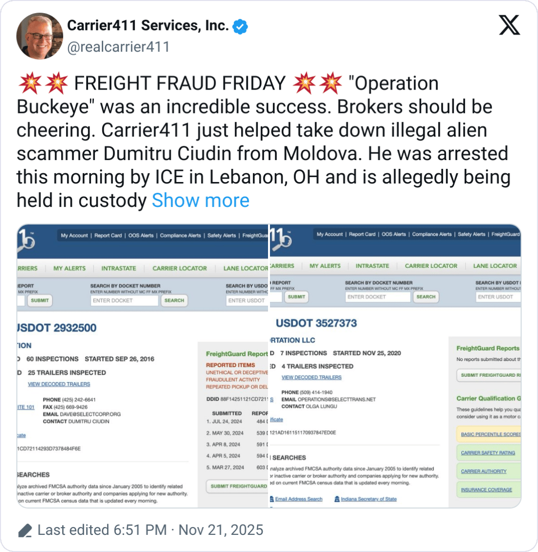 Carrier411 announced that “Operation Buckeye” — conducted with HSI and ICE — led to the arrest of Dumitru Ciudin, an alleged illegal operator from Moldova linked to a fraud network involving roughly 400 MC numbers. The arrest, captured in real time by Carrier411 on the ground in Lebanon, Ohio, marks one of the most visible freight-fraud crackdowns in recent memory.