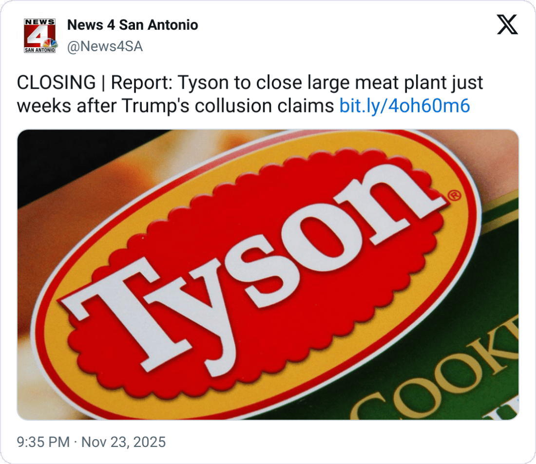 🥩 Tyson Closure. Tyson plans to close its large beef plant in Lexington, Nebraska, affecting 3,200 workers, as price-fixing scrutiny intensifies. The move follows Trump’s call for a DOJ probe into “illicit collusion” by major meat packers.