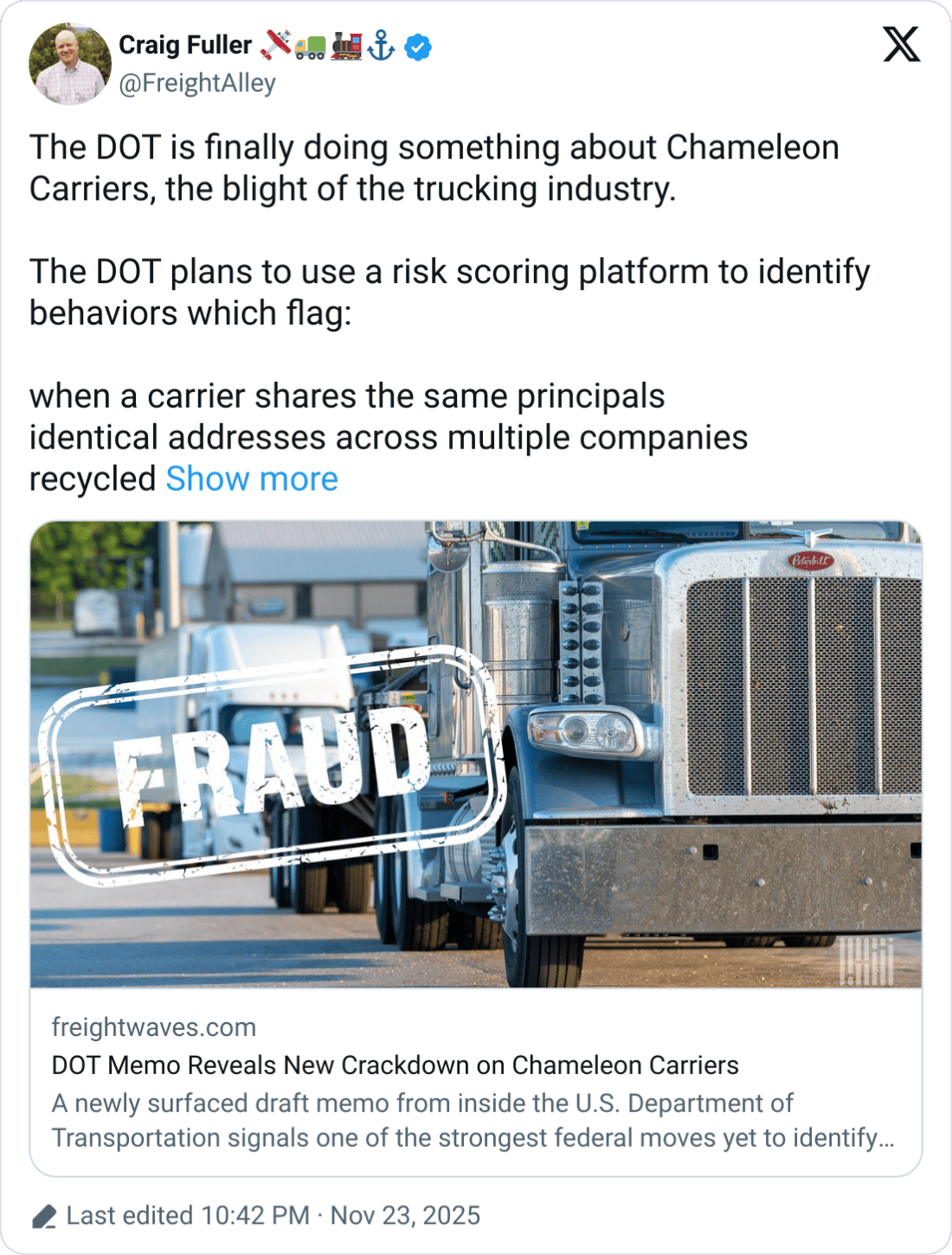 🕵️ DOT Leak Signals Major Crackdown on Chameleon Carriers. Adam Wingfield gave this editorial on a leaked DOT memo, showing regulators are preparing for their toughest move yet against “chameleon carriers,” the companies that shut down after violations and reopen under new identities. The draft outlines a new data-driven severity scoring system that flags carriers using recycled addresses, phone numbers, equipment, and rapid DOT-number turnover. DOT says these operators exploit FMCSA registration gaps, undercut compliant carriers, and put unsafe trucks back on the road. If the plan becomes policy, high-risk fleets could be targeted for fast audits and shutdowns, reshaping enforcement and leveling the playing field for legitimate small carriers.