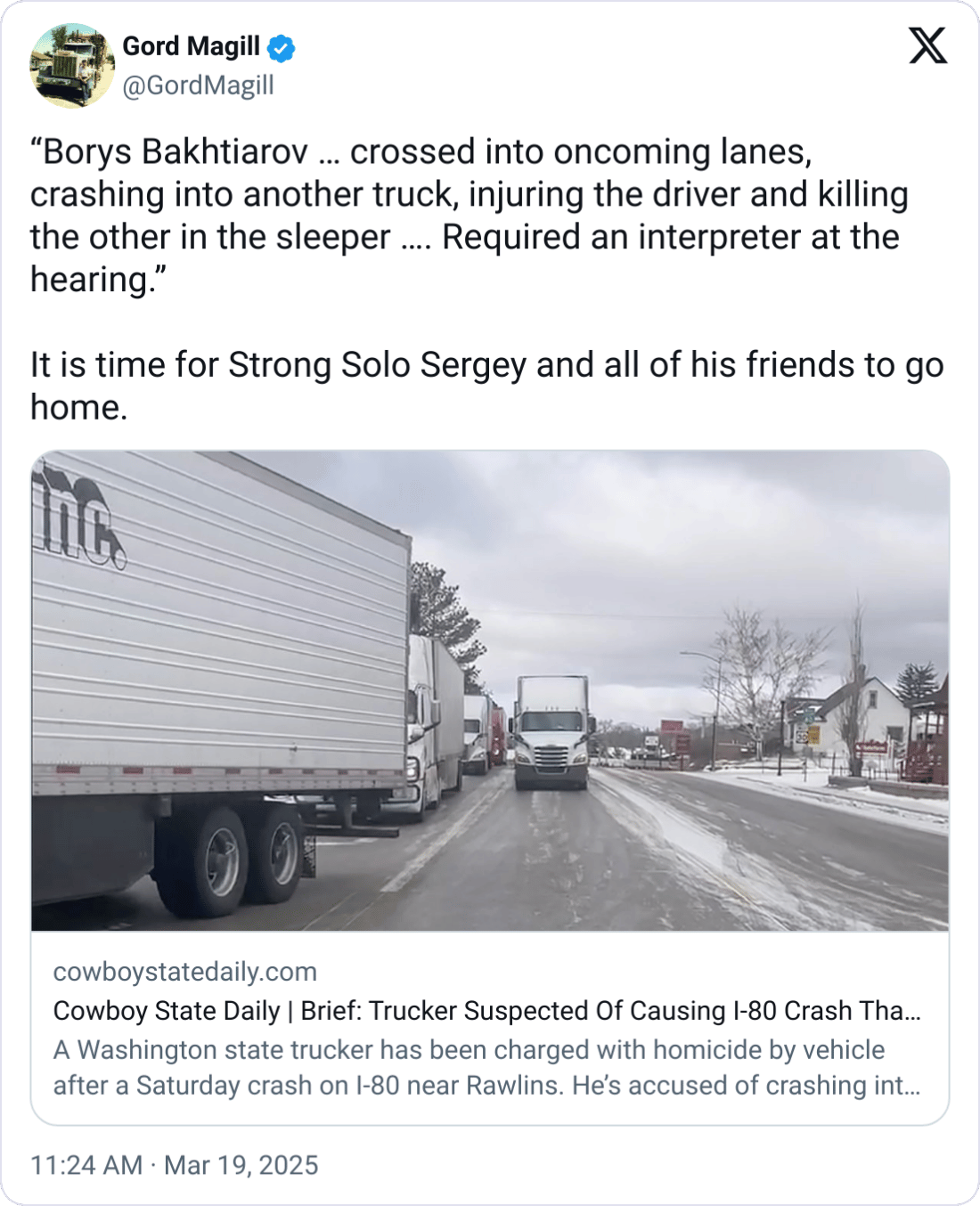 🪦 I-80 Fatal Crash. A Washington trucker faces charges after crossing lanes on I-80, causing a crash that killed a co-driver in a sleeper cab.