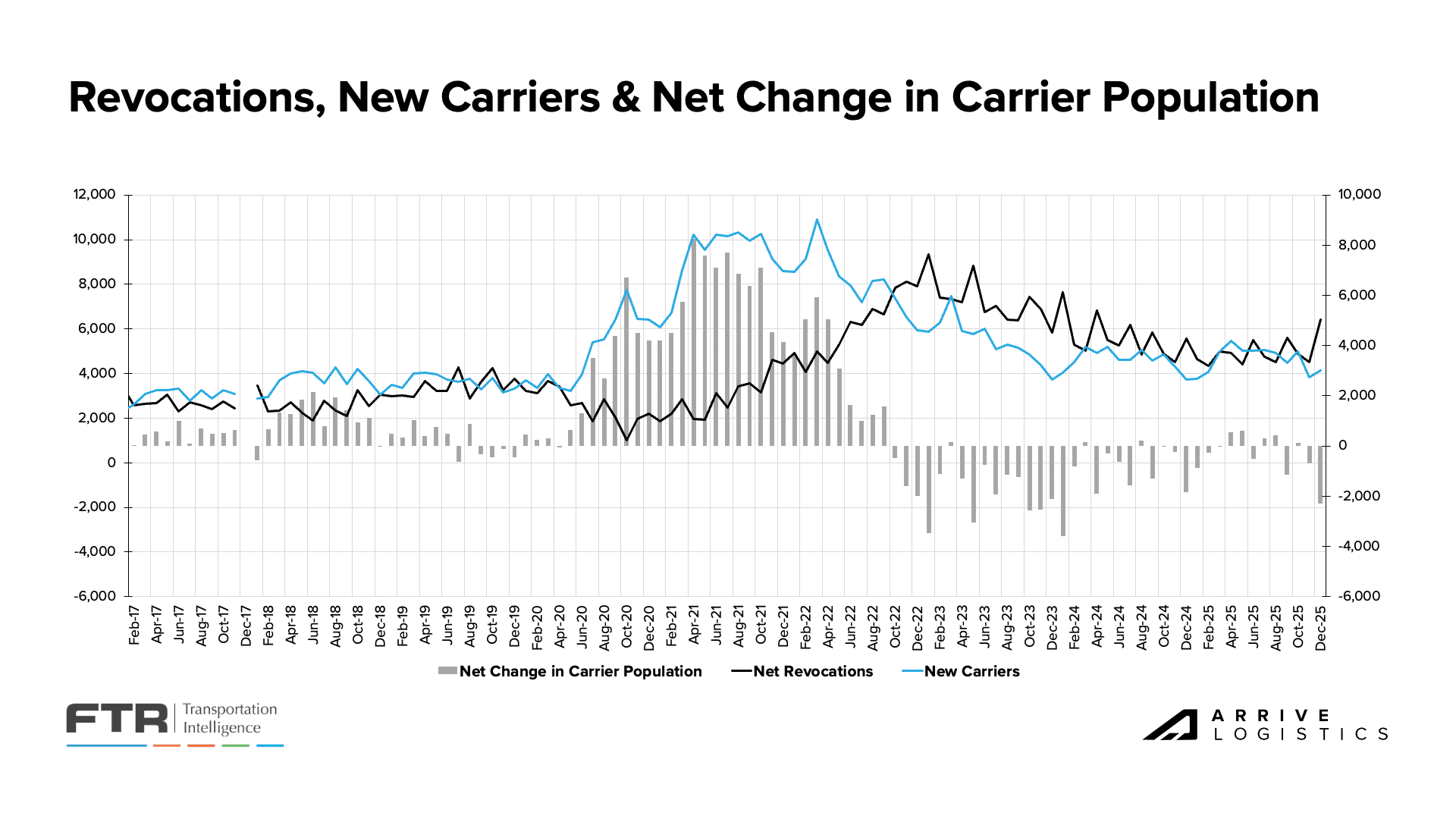 FTR data shows the for-hire carrier population fell by 2,287, the largest monthly decline since early 2024. Source: Arrive Logistics, FTR Transportation Intelligence