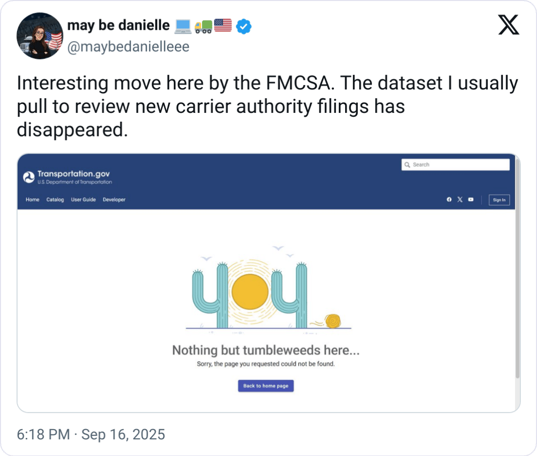 The freight world came across a major curve ball yesterday: FMCSA pulled large chunks of its daily datasets off the DOT’s public portal with no explanation.What disappeared? Company census files, crash files, inspection and citation records, the very data brokers and compliance teams rely on to vet carriers and fight fraud. Monthly snapshots remain, but many daily updates are gone, leaving brokers and platforms that rely on that data lagging by 24+ hours.