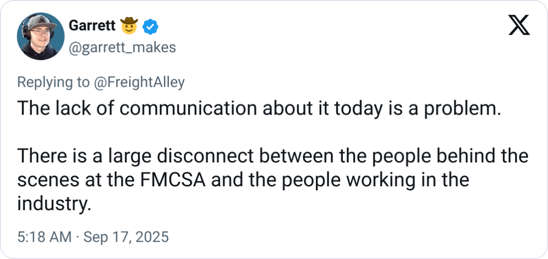 Steve Oatley (@steveoatley): “How do you fight freight fraud? Shut off the important data feeds brokers use to vet carriers. Way to go, FMCSA.”