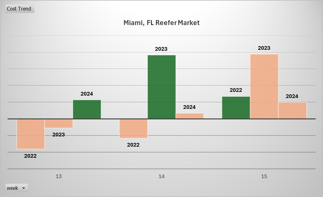 These results are particularly interesting when you consider that in 2022, Miami was the hottest reefer market in the nation during the week leading up to Easter, whereas in 2023, Easter week was only the 9th hottest reefer market.