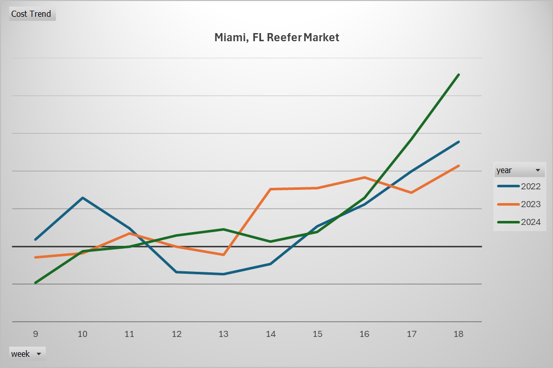 In short, seasonality—not the Easter holiday itself—is what drives reefer market heat this time of year. Miami remains the exception, but even there, produce timing has a stronger influence than Easter weekend.
