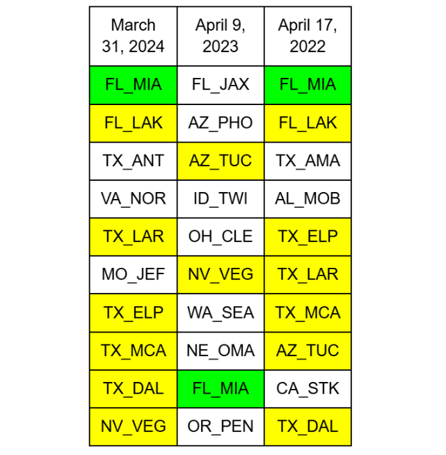 Green indicates markets that appear in the top 10 all three years, yellow for those that appear in 2 of 3 years. All of these markets are located in the Sun Belt and coincide with the start of produce season in that region.