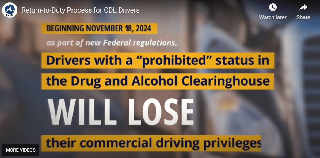 đĽ FMCSA Explains Return-to-Duty Process. The FMCSA has released a video guide explaining the steps for truck drivers to regain their commercial driving privileges after Drug & Alcohol Clearinghouse violations.