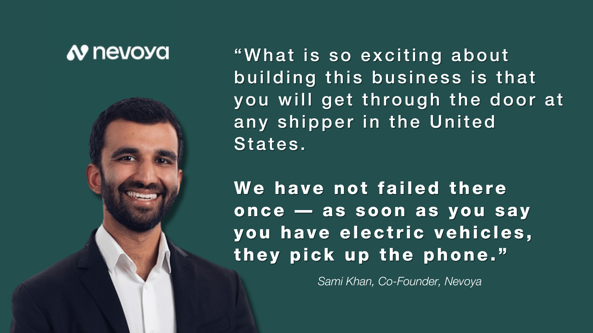 Even with fewer than 0.1% of U.S. trucks being electric, demand for cleaner shipping solutions is growing fast. As Khan points out, “We have not failed there once — as soon as you say you have electric vehicles, they pick up the phone. They escalate.”