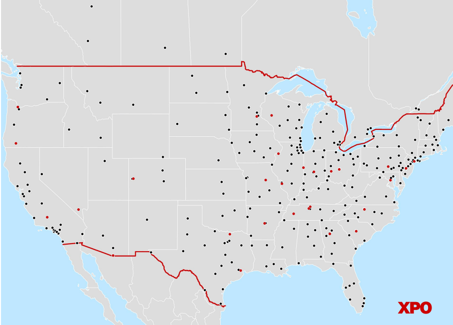 XPO's network covers "99% of US zip codes," with service centers in black and acquired service centers in red. Image Source: XPO