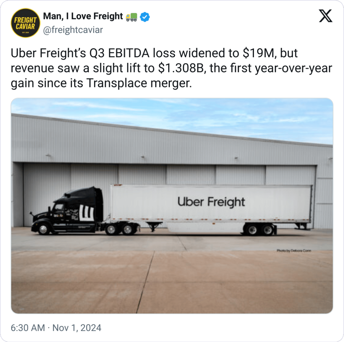 🚛 Uber Freight's Mixed Q3 Results: Wider Loss, Rising Revenue. Uber Freight posted an EBITDA loss of $19 million in Q3 2024, its third-largest since integrating with Transplace. Despite the negative earnings, the company saw a slight year-over-year revenue increase to $1.308 billion, marking a rare uptick in gross bookings since the merger. While Uber Freight continues to expand technologically and grow in cross-border trade, skepticism remains over its future within Uber Technologies. CEO Dara Khosrowshahi is confident of the future but is also watching the market “very carefully.”