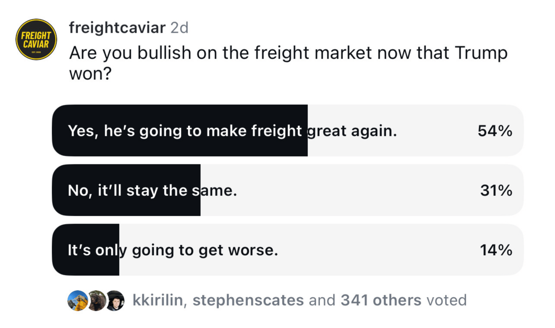 Out of 343 participants in our Instagram poll, 54% believe the freight market will improve, 31% think it will stay the same, and 14% expect it to worsen under Trump.