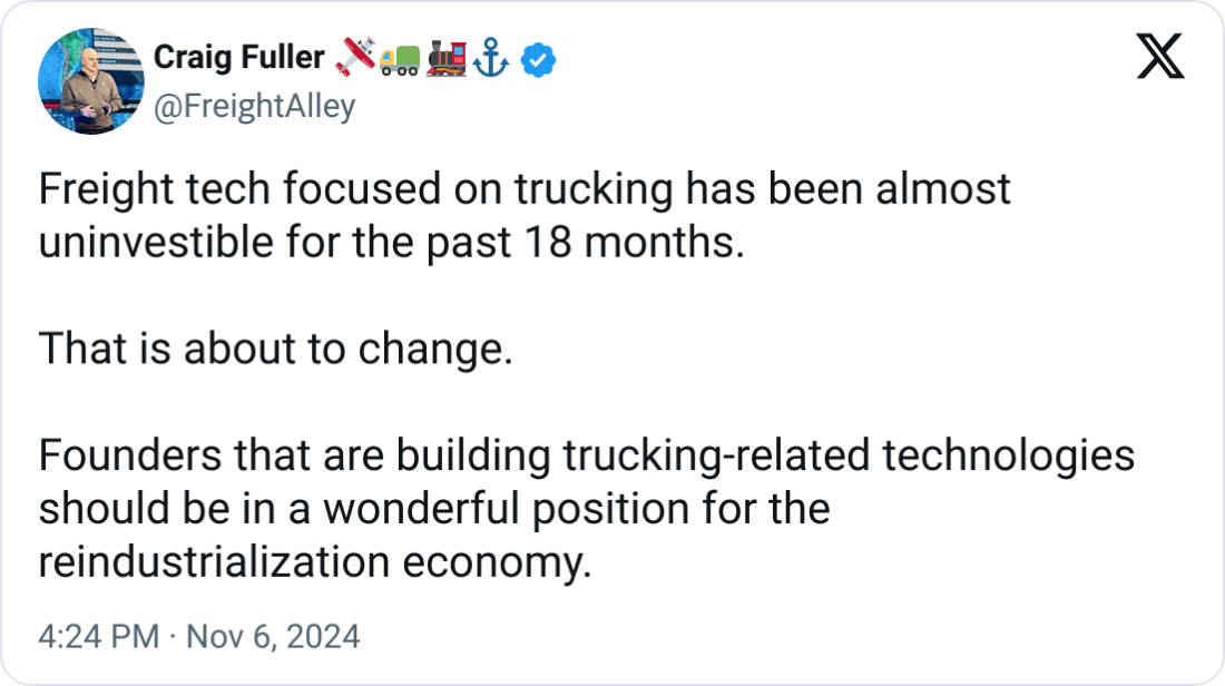 Conferences: F3 Future of Freight Festival, November 19-21 in Chattanooga. Get $1395 off with our special link. In February, join us at Manifest Vegas 2025. Register with our link and save $200.