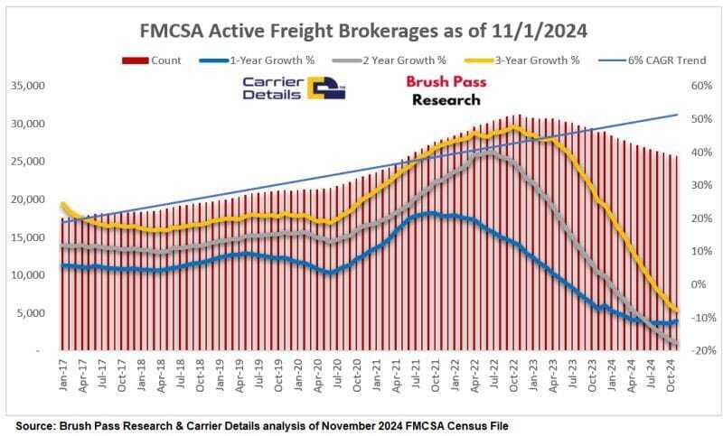 📉 Freight Brokerage Decline Slows; Recovery Remains Uncertain. For the first time this year, the sharp drop in freight brokerage authorities has slowed. Data from Carrier Details and Kevin Hill's Brush Pass Research shows a 10.9% decline year-over-year, but this is the first pause in the downward trend for 2024. It could be an early sign that we’re hitting the bottom, though it’s still too soon to call it a recovery. Looking further back, the industry’s consolidation remains significant, with 17.5% fewer active brokerages than two years ago. So, while this stabilization offers some relief, the broader market still needs a serious shift before we see true growth return, Hill explains.