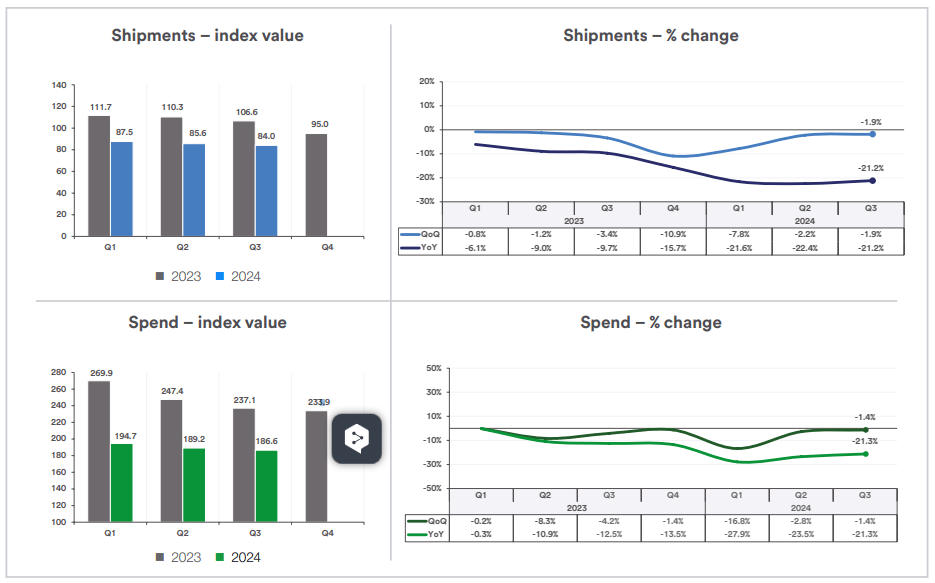 The Q3 2024 U.S. freight payment index shows a slowdown across the freight market, with both the shipment and spending index values dipping. But thereâs a silver lining: the rate of decline is slowing, hinting at the possibility of hitting the bottom.