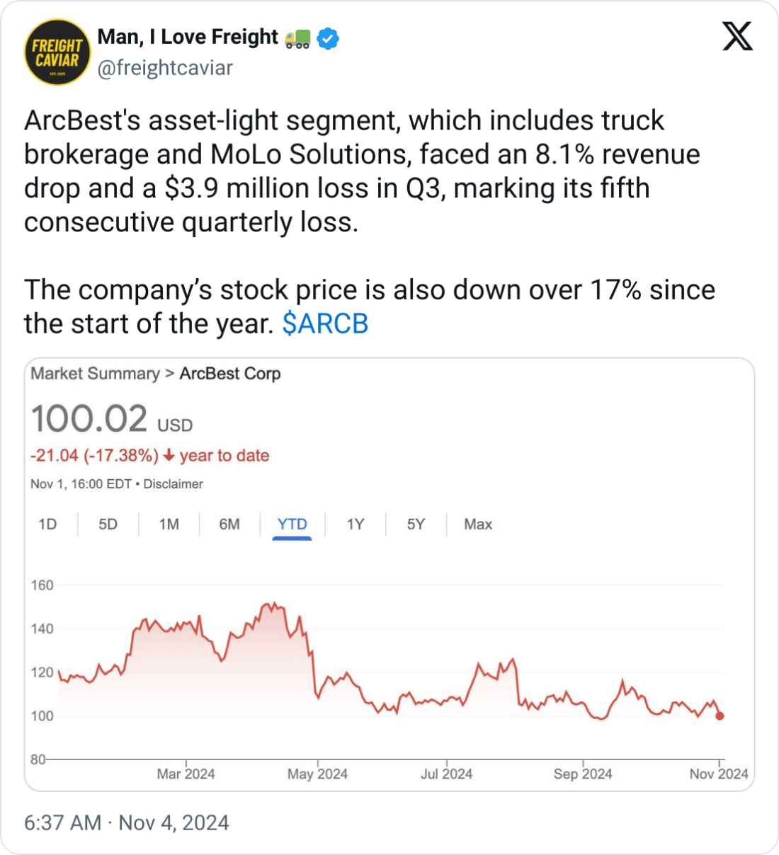 đ ArcBest Sees Challenges & Growth. ArcBestâs asset-light segment, including truck brokerage & MoLo Solutions, reported a $3.9 million operating loss in Q3, its fifth consecutive quarterly loss, as revenue declined 8.1% year-over-year to $385.3 million due to weak demand and lower shipment sizes. Despite this, the company achieved a 187% rise in net income to $100.3 million ($4.23 per share), driven by rigorous cost controls, productivity improvements, and a $69.1 million adjustment from a previous acquisitionâs earnout provision. While both the asset-based and asset-light segments faced headwinds, ArcBest remains focused on managed transportation growth and strong customer retention to support long-term strategic goals, according to CEO Judy McReynolds.