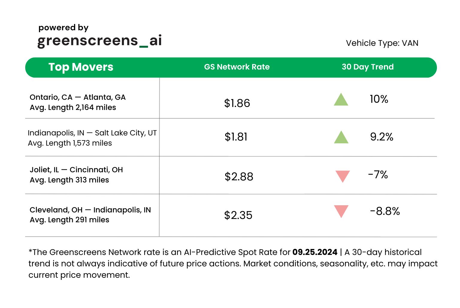 *Greenscreens.ai, forecasts real-time truckload buy prices that are suited to each freight brokerage's purchasing power using AI and machine learning. Its engine takes into account over 130 attributes and data points in each rate forecast.