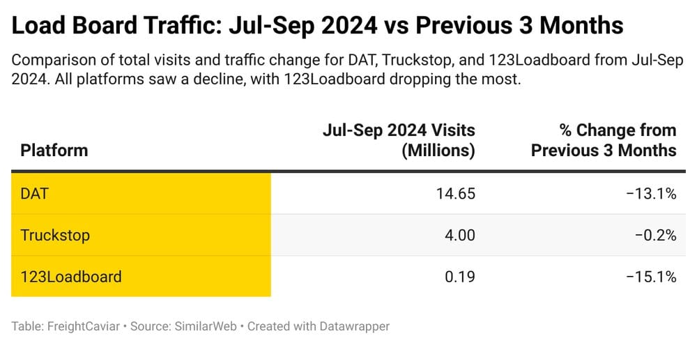 š Load Board Traffic Declines. Traffic across top load boards like DAT and 123Loadboard dropped, while Truckstop remained steady, possibly due to company closures and shifting subscriptions.