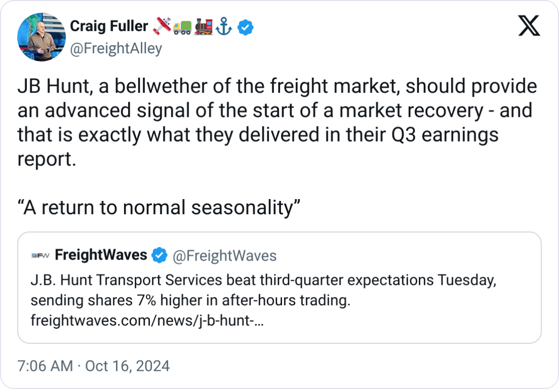 Freight Volumes Still Low: Miller notes that freight volumes remain down year-over-year and disagrees with Fullerās view of the market as strong. He expects improvements in early 2025 but not a major rebound.