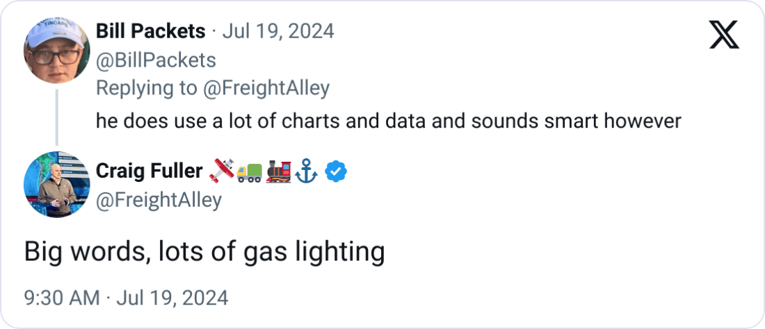 Fullerās Criticism: Fuller has criticized Millerās reliance on government data, arguing that it lags behind real-time market trends. He claims Miller missed key moments like the 2020 freight boom and the 2022 recession, often being ātwo quarters behind.ā