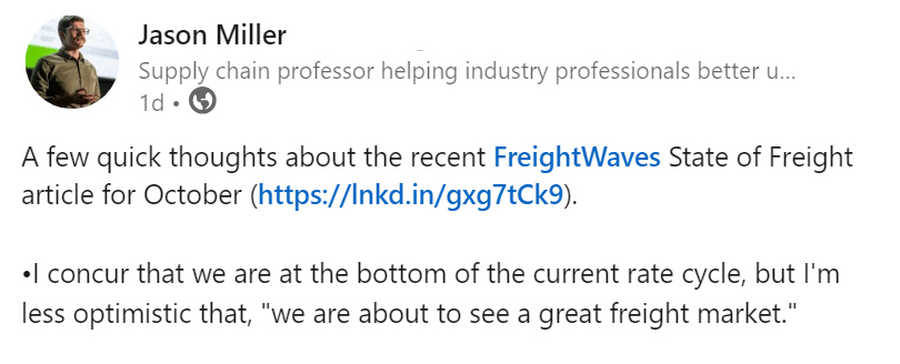 Millerās Analysis: Logistics consultant Brittain Ladd once suggested that FreightWaves should hire Miller for more accurate analysis. Former DAT Marketing Director Sandy Cahill has also praised Millerās independent thinking and ability to challenge misinformation.