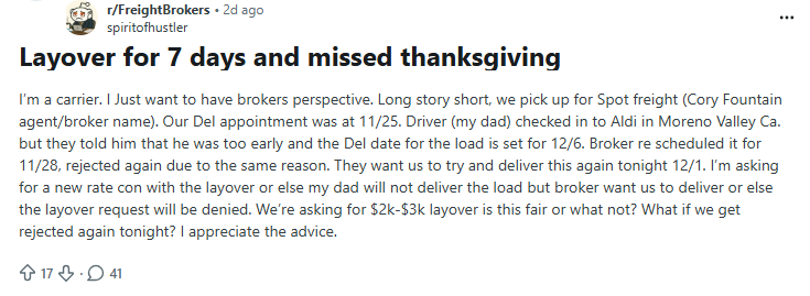 A post on r/FreightBrokers described a carrier stuck for seven days with a load for ALDI in Moreno Valley after repeated appointment rejections, missing Thanksgiving in the process. The broker pushed for redelivery attempts while refusing to confirm layover pay unless the load was delivered. The carrier asked whether a $2,000–$3,000 layover was reasonable.