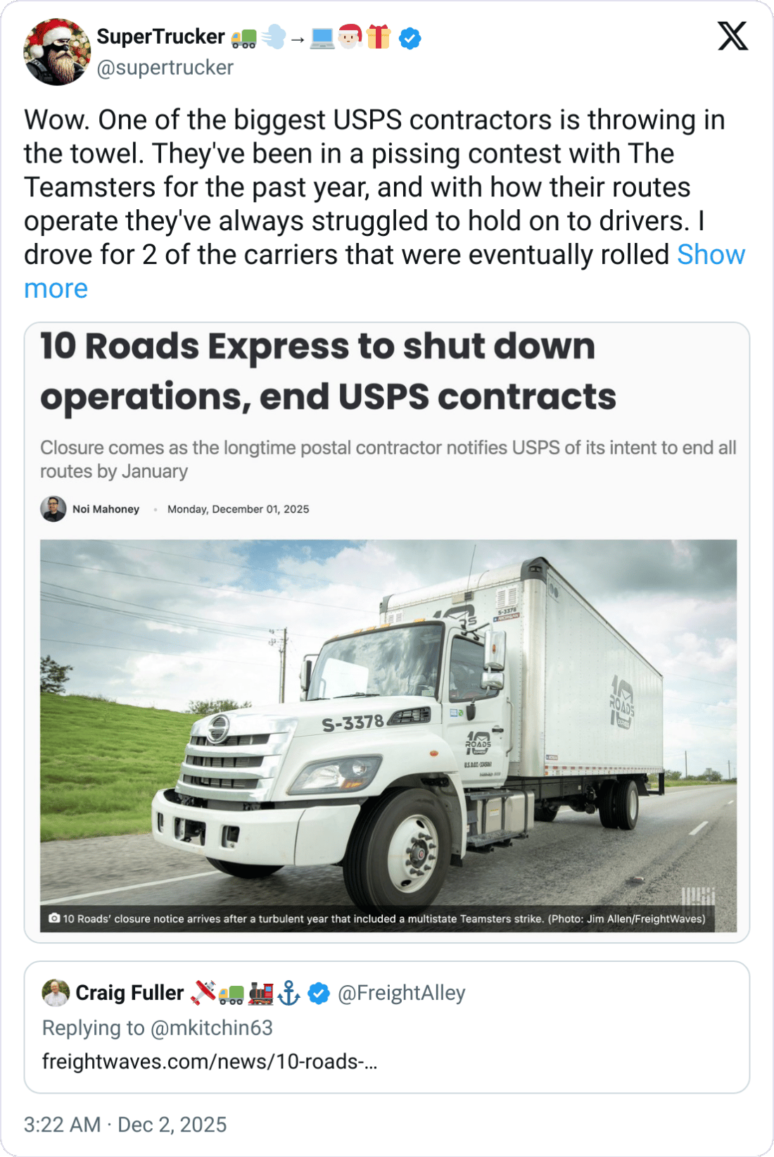 As a longtime backbone hauler for the U.S. Postal Service, 10 Roads’ collapse will tighten capacity in mail-dependent lanes and send more USPS volume into the spot and brokered markets. The shutdown follows a year of labor unrest and stalled recovery efforts, underscoring how rapidly USPS’s contracting strategy is reshaping the carrier landscape.