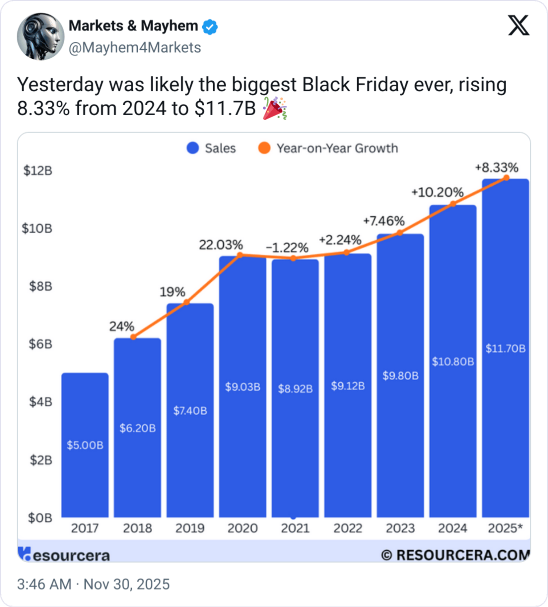 đď¸ Black Friday Stays Big, Even as Shoppers Pull Back. Black Friday kicked off with heavy mall traffic and solid early momentum, even as retailers face a tougher economic backdrop shaped by tariffs, softening job growth, and fading consumer confidence. Shoppers leaned hard into discounts and shifted spending toward smaller-ticket buys. Mall traffic has surpassed 2019 levels, and retail groups expect holiday sales to grow roughly 3.6â4%. But budgets are tightening: consumers planned to spend about $890 on average, while tariffs have pushed retail prices up nearly 5%. Online channels continue to dominate as promotions stretch across weeks rather than a single shopping day.