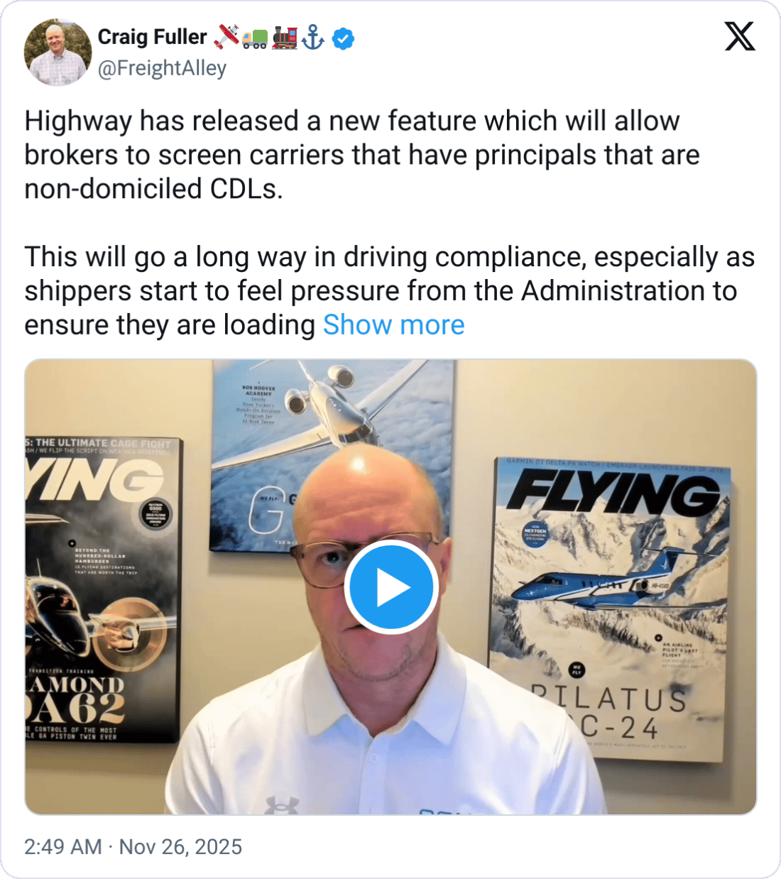 Happy Monday. Highway quietly shipped a new screening rule that lets brokers filter out carriers linked to non-domiciled CDL holders. A breakdown and the reactions in today's feature.