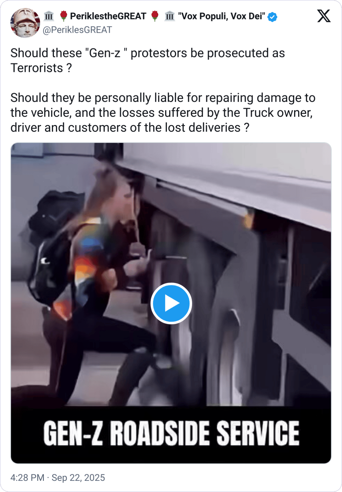 An X post questioned whether recent Gen-Z protestors who damage trucks during protests should face terrorism charges and financial liability for damages, delivery delays, and losses suffered by carriers and customers. While in America we do have the right to protest, we do not have the right to vandalize property.