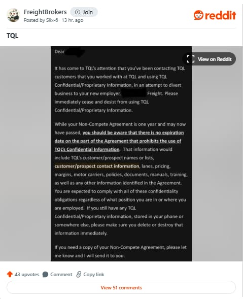 A recent discussion on r/FreightBrokers has sparked debate after a former Total Quality Logistics employee shared an email the company sent regarding its non-compete and non-solicitation agreement.