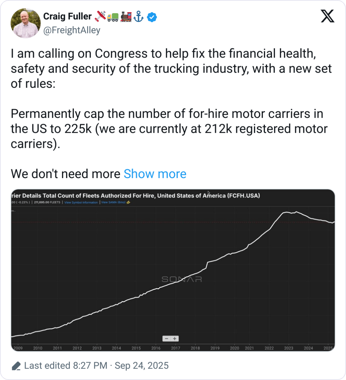 Craig Fuller urged Congress to overhaul trucking regulations by capping the number of motor carriers, tightening transfer approvals, and restricting foreign ownership. Fuller warned unchecked growth invites unqualified operators, undermining safety and legitimate competition. There is a debate brewing within the post's comment section with some for and against this proposal. Take a look a the thread when you have time.