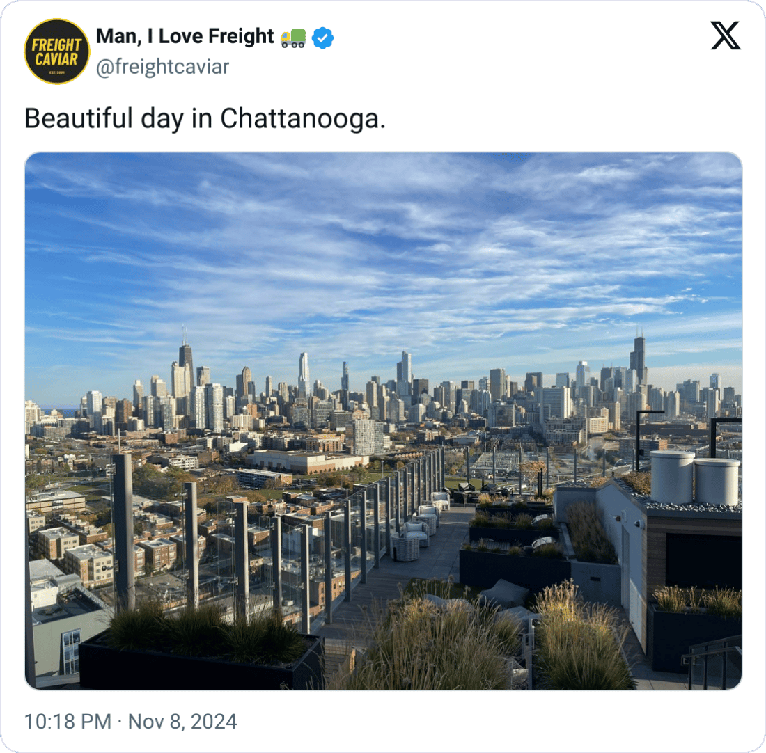 Conferences: F3 Future of Freight Festival, November 19-21 in Chattanooga. Get $1395 off with our special link. In February, join us at Manifest Vegas 2025. Register with our link and save $200.