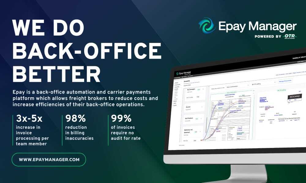 Epay's platform is designed to virtually eliminate operational reliance on email and the need to audit carrier invoices for rate and delivery information, thanks to its Audit Proof Invoicing feature. Backed by the power of OTR Solutions, Epay Manager now offers integrated AI-driven NLP automation and working capital solutions. See what Epay can do for you: