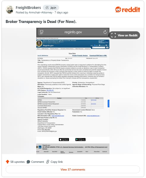 This week on r/FreightBrokers, users responded to the FMCSA’s decision to scrap a proposed broker transparency rule that would have required brokers to provide transaction records in electronic format within 48 hours of a carrier’s request. While the agency signaled it will return to the issue with a new proposal in May 2026, the freight community had plenty to say about why the original rule failed—and what should come next.