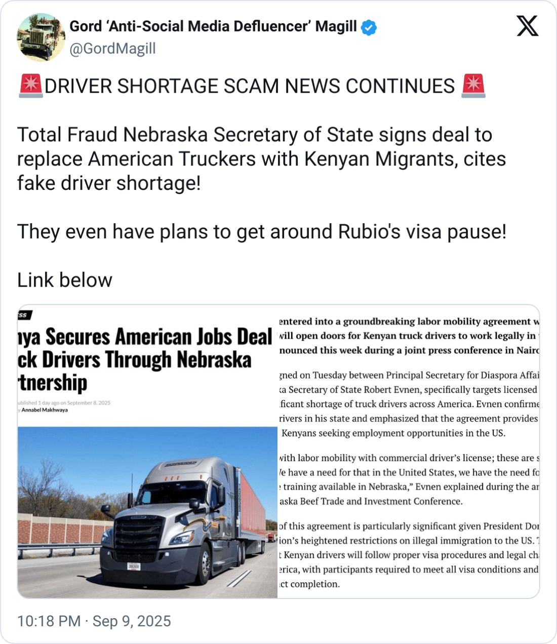 A post from Gord Magill drew strong attention this week after he blasted Nebraska’s new labor deal with Kenya as part of the “driver shortage scam.” His viral tweet called the program “total fraud” and accused U.S. officials of “replacing American truckers with Kenyan migrants,” citing what he claims is a manufactured driver shortage narrative.