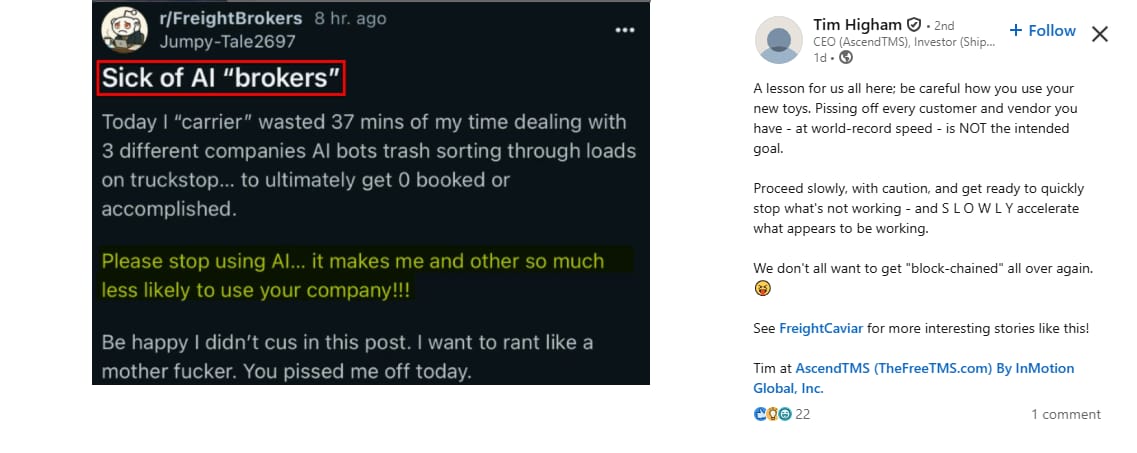 Tim Higham, CEO of AscendTMS, offered a timely warning about AI misuse in freight. Citing a frustrated Reddit post from a carrier who spent 37 minutes battling unhelpful AI bots, only to book nothing. Higham called for restraint in how the industry rolls out automation.