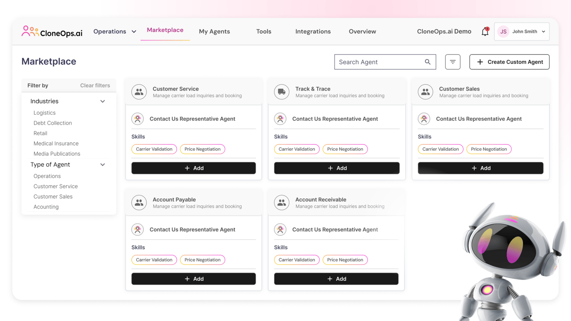 With CloneOps.ai, logistics teams get a partner who works with you to deploy agents where they’ll deliver the most impact, without upending your operations. Start with one task, prove the value, and grow from there with CloneOps.ai supporting every step.